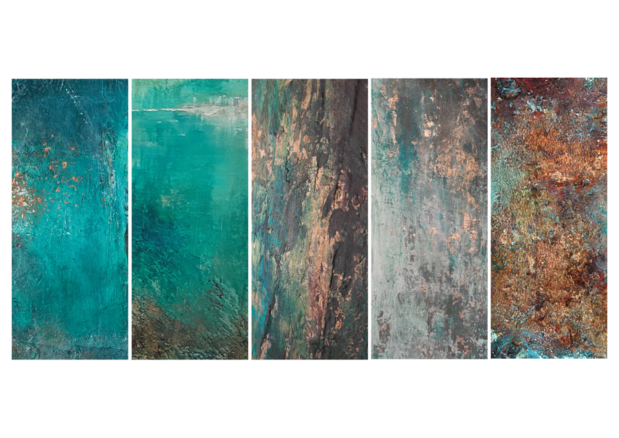 My work is influenced by my love of the natural world & the visual beauty of patina in urban decay. Inspiration is everywhere; from a delicate leaf, to spectacular seascapes, or a rustic door; exploring the colours & textures through intuitive mark-making. I am drawn to a mesmerizing palette of deep sea blues, rust & verdigris & often portray nature with a fragile, distressed surface, which I hope emphasizes & subtly reflects the earth's environmental crisis.My creative process is led by instinct, emotion & spontaneity, building up layers of paint with mixed media to create a rich depth which evokes a sense of history, place & otherworldliness.